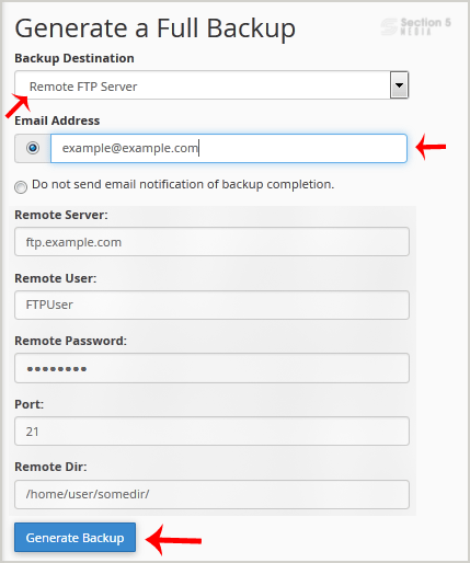 5. Once you fill in the Remote FTP details, click on the Generate Backup button.