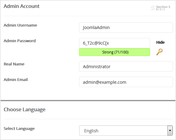 - Admin Username: Your new Joomla username (for security reason do not use the Administrator or the Admin username.)