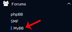 4. On the left side of your screen, you should locate the Forums category. Click on it and then click on the MyBB link that will appear.